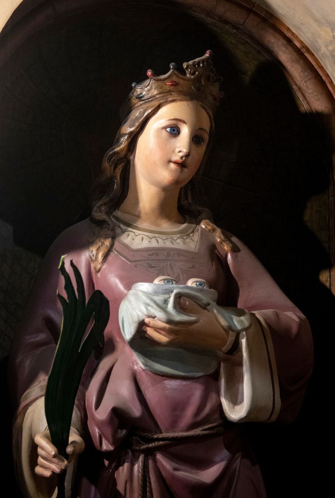 Najstarejši zapis o sveti Luciji sega v 5. stoletje. Do leta 1861 so bile njene relikvije v njej posvečeni cerkvi v Benetkah, potem pa so jih prenesli v cerkev svetega Jeremije prav tako v Benetkah, kjer se nahajajo še danes. Sveto Lucijo največkrat upodabljajo z očmi na krožniku, čeprav to ni njen edini atribut. Sveta Lucija je zavetnica slepih, prodajalcev in mesta Sirakuze na Siciliji.