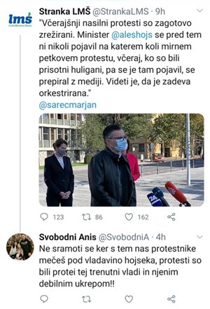Urednica informativnega programa TVS Manica Janežič Ambrožič, urednica ter voditeljica Tednika TVS Jelena Aščić in novinar TVS Boštjan Veselič Golob so sami dejavno, jasno in nedvoumno pritrdili javno izrečeni obtožbi ministra Hojsa o permanentni in vztrajni medijski podpori urednikov in novinarskih aktivistov TV Slovenija "spontanim" in "brezimnim" organizatorjem nelegalnih uličnih zbiranj in polit-kolesarjenj ter nelegalnih kršitev proti-epidemijskih začasnih ukrepov, ki so minuli četrtek prerasle v nezaslišan in nepredstavljiv ulični teror nasilnega anarhističnega huliganstva z različnih koncev zbranega lumpen-proletariata (navijaških, kriminalnih, narko-dilerskih, tihotapskih, izterjevalsko-zaščitniških nasilniških skupin itn.).