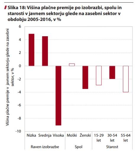 Konkretneje. Iz desnega grafa je razvidno, da so zaposleni z nižjo izobrazbo v primerljivih poklicih javnega sektorja plačani približno 5 odstotkov bolje kot v zasebnem sektorju, tisti s srednjo izobrazbo 4 odstotke bolje, tisti z visoko izobrazbo pa okrog 9 odstotkov slabše kot v zasebnem sektorju.