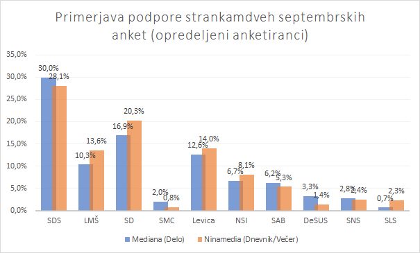 Če bi bile volitve minulo nedeljo, bi po poizvedovanju Ninamedie za Večer in Dnevnik največ podpore dobila SDS - 18,4 %, Socialne demokrate bi volilo 13,3 % vprašanih in Levico 9,2 %. Sledijo LMŠ z 8,9 %, NSi s 5,3 % ter SAB s 3,5 %, kar bi zadostovalo za uvrstitev v državni zbor.