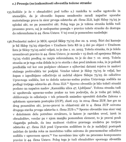 Upravno sodišče je v sodbi IU 1794/2025-32 z dne 25. november 2025 ugodilo tožbi Piratov in županovo odločitev razveljavilo. Po oceni sodišča je odločitev župana Zorana Jankovića nezakonita, in sicer zaradi napačne uporabe materialnega prava. Sklep po presoji sodišča ne pomeni posamičnega, temveč splošni abstraktni akt, zoper katerega je referendum dovoljen. Obrazložitev zavrnitve pobude je bila po oceni sodišča prav tako presplošna in nezadostna, pri izdaji odločitve pa župan ni upošteval določb Zakona o upravnem postopku.