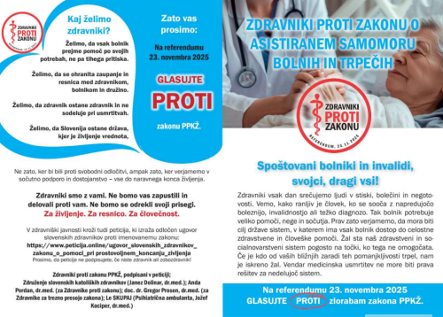 Zdravstveni delavci, zbrani v Združenju slovenskih katoliških zdravnikov, nasprotujejo Zakonu o pomoči pri prostovoljnem končanju življenja. »Naše stališče temelji na krščanskem in humanističnem pojmovanju svetosti življenja, katerega neodtujljivo dostojanstvo nam prepoveduje, da življenje trpečega bodisi aktivno skrajšujemo bodisi podaljšujemo, če ob tem ne moremo pričakovati dobrobiti za posameznika,« so zapisali in poudarili, da jim krščanske in strokovne vrednote še posebej narekujejo skrb za najbolj ranljive, kot so težko bolni, nemočni in osamljeni, katerih ranljivost omenjeni zakon zaradi prikritih pritiskov močno povečuje.
