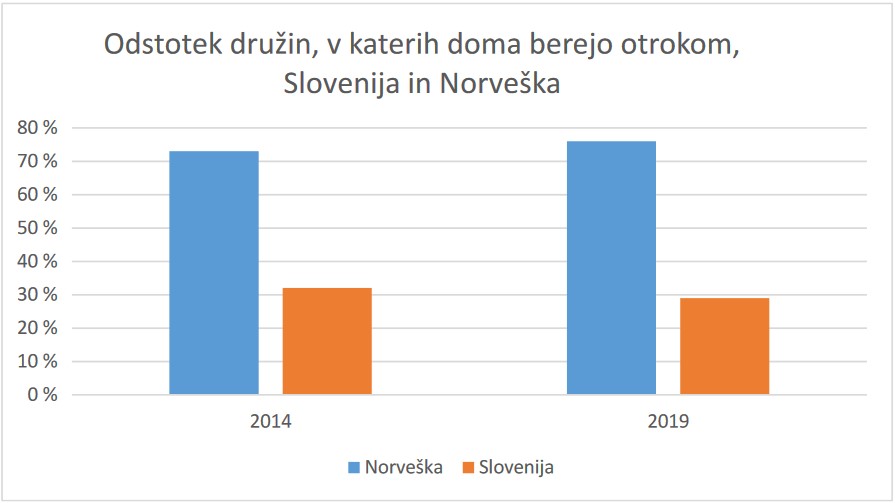 Na Norveškem otrokom tako doma pogosto berejo v 76 % družin, v Sloveniji pa v 29 % družin – kar je razlog, da na Norveškem tudi med odraslimi bere mnogo več ljudi, kot v Sloveniji.