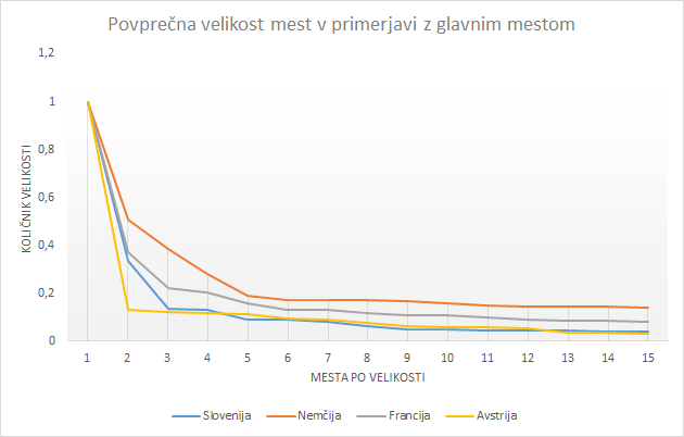 Iz grafa lahko ugotovimo, da so slovenski rezultati v posameznih segmentih še nekoliko slabši od Avstrijskih. Slovenija po primerjavi razporeditve prebivalstva sodi med najbolj centralizirane države v Evropi. Slovenska mesta so namreč v primerjavi z mesti iz držav, ki skrbijo za uravnotežen razvoj države, najmanj dvakrat do trikrat manjša.