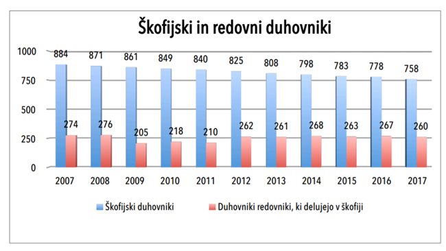 Število katoličanov v Sloveniji upada, vzporedno s tem pa tudi zanimanje za duhovniške poklice. Po poročilu o delu Katoliške cerkve v Sloveniji za leto 2018 se je število katoliških duhovnikov v Sloveniji med leti 2007 in 2017 zmanjšalo za 140 (iz 1158 na 1018). V istem obdobju je Slovenija dobila 101 novega duhovnika, v zamejstvu in tujini pa še 25.