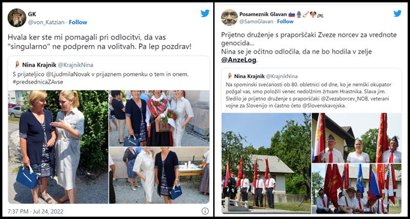 »Kako nam je Nina Krajnik s parimi slikami olajšala odločitev, kajne?« ter … »Hvala ker ste mi pomagali pri odlocitvi, da vas "singularno" ne podprem na volitvah«. Tovrstnih komentarjev je bila pretekli teden deležna predsedniška kandidatka Nina Krajnik, pod tvitom s fotografijo, s katere se smehlja skupaj s "prijateljico Ljudmilo Novak".