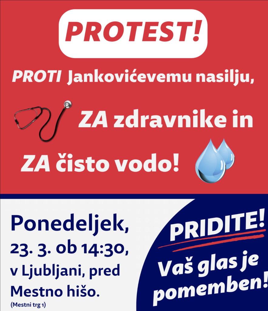 Glas za otroke in družine pod vodstvom Aleša Primca danes, v ponedeljek, 23. 3., ob 14.30 vabi na že 29. shod za zaščito pitne vode v Ljubljani. Shod bo v Ljubljani, pred mestno hišo. Borijo se, da bi vodo ohranili čisto, da je ne bi ljubljanski župan Zoran Janković zastrupil z izgradnjo kanala C0. Dodali so še, da se borijo tudi proti Jankovićevim 10 odstotkom.