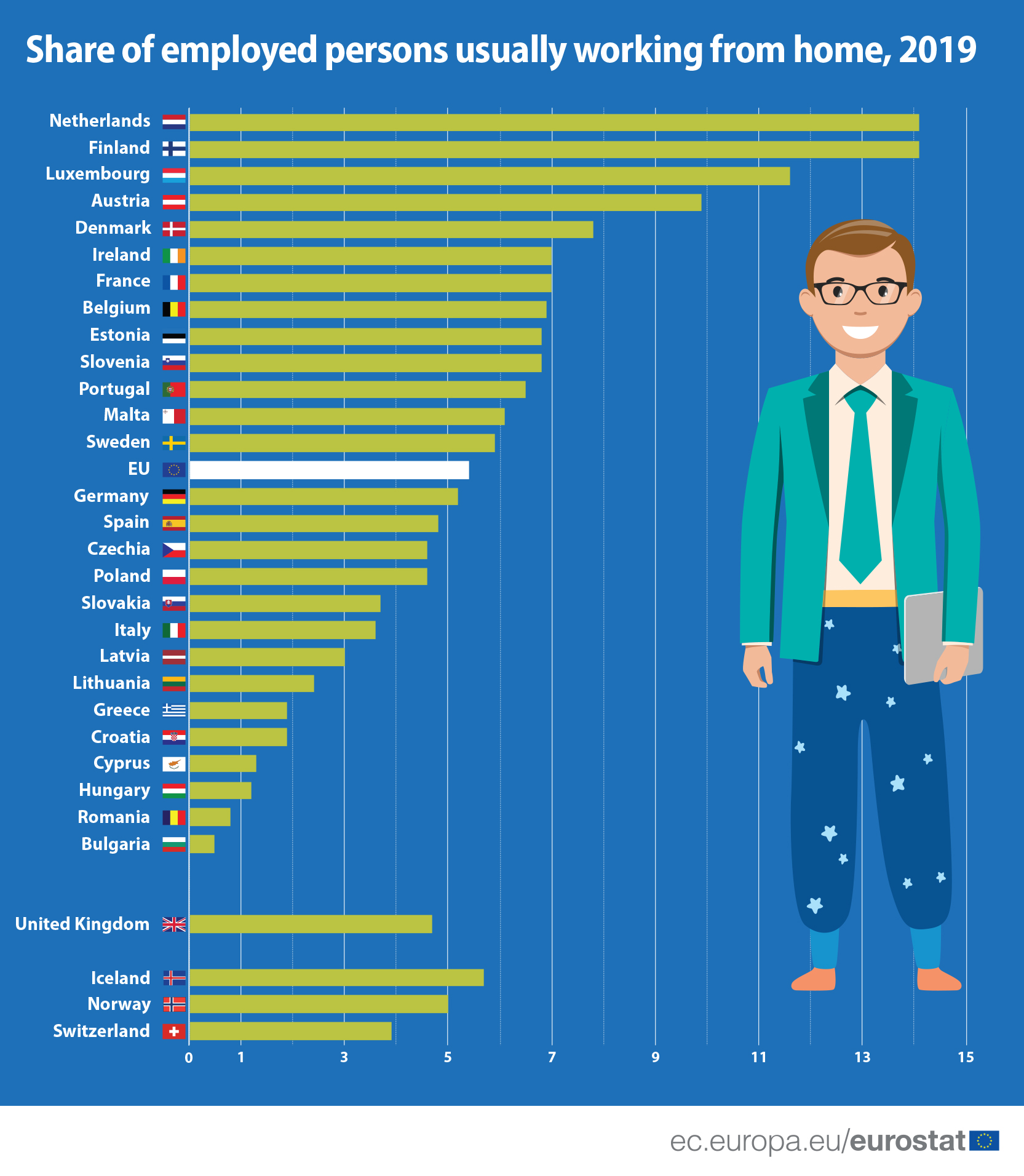 Podatki Eurostata kažejo, da je v letu 2019 od doma običajno delalo 5,4 % Evropejcev, največ na Nizozemskem in Finskem (14,1 %), najmanj pa v Bolgariji (0,5%) in Romuniji (0,8%). Slovenija je na tej lestvici nadpovprečna, saj je v letu 2019 na daljavo delalo 6,8 % zaposlenih.