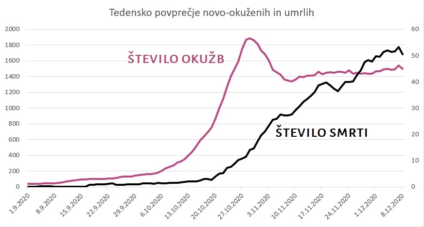 Graf okuženih in umrlih. Vir podatkov: Covid sledilnik in NIJZ. Uporabljeno je tedensko povprečje, da izločimo skoke ob koncih tedna, ko je manj testiranj in se jasneje izkažejo trendi.