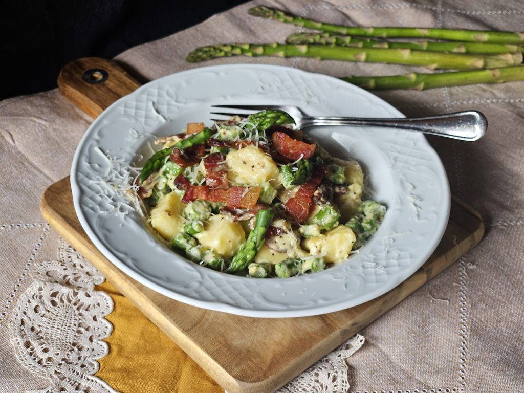 Domači njoki s šparglji in slanino svinjskih ličnic