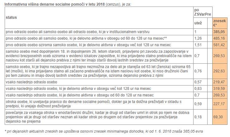 Ni pa se spremenila zgolj višina socialne pomoči, ampak tudi ponderji za preračun njene višine. Osnova je po novem 385 €, glede na osebne okoliščine pa prejemnik dobi odstotke tega zneska.