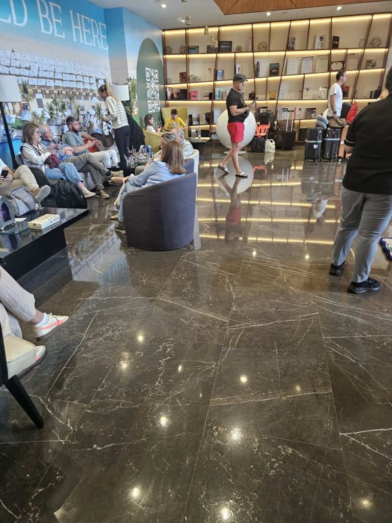 Zdaj so Slovenci že ves dan v avli hotela. Slišijo se preleti letal in prestrezanja raket. Ni prijetno, pravi Jagodič. »Ena skupina pred nami je zjutraj že poletela, pa so jih po dveh urah vrnili nazaj na letališče. Zvečer so jim našli sobe, ampak tukaj je veliko turistov brez sob, ki čakajo.« Potne liste imajo pri sebi. Do torka lahko ostanejo v hotelu, potem pa ne vedo, kako naprej. Oblasti odsvetujejo zadrževanje na ulicah in na vseh zunanjih površinah. »Svetujejo, da ostanemo v stavbah in stran od oken, zaradi morebitnih ostankov prestreženih objektov. Plaže so zaprte.«