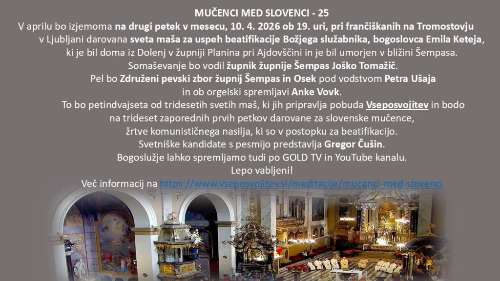To bo petindvajseta od tridesetih svetih maš, ki jih pripravlja pobuda Vseposvojitev ter so bile in še bodo na trideset zaporednih prvih petkov darovane za slovenske mučence, žrtve komunističnega nasilja, ki so v postopku za beatifikacijo.