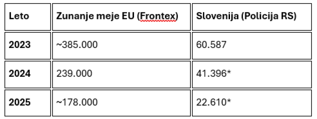 Na prvi pogled se morda zdi protislovno, da Evropski parlament sprejema najstrožjo migracijsko zakonodajo in odpira centre za deportacijo natanko v trenutku, ko uradne številke prihodov po Evropi in v Sloveniji drastično padajo. Leta 2023 je bil absolutni vrhunec, ko je bilo najvišje število prihodov po letu 2016, a sta mu sledila ostra padca v letih 2024 in 2025. V Sloveniji se je pritisk na meje v letu 2025 skoraj prepolovil v primerjavi z letom prej.