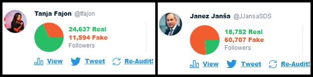 Kljub temu, da je število lažnih sledilcev Janeza Janše večje od števila lažnih sledilcev Tanje Fajon, je to povsem pričakovano glede na različna statusa. Vodji držav oziroma visoki člani vlad imajo običajno večje število lažnih sledilcev. Poleg tega je potrebno omeniti, da je predsednik vlade s svojimi angleškimi tweeti o ameriških volitvah nepričakovano dosegel ameriški algoritem, kjer je število lažnih uporabnikov veliko večje kot pri nas.