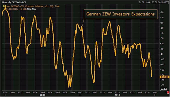 Zaskrbljujoč je tudi danes objavljeni kazalnik zaupanja finančnih vlagateljev v Nemčijo ZEW, ki je dosegel najnižjo raven po decembru 2011 (celo nižjo od najbolj pesimistične napovedi Bloomberga), sredi finančne krize. Zaupanje vlagateljev tudi tokrat pomeni recesijska tveganja in še dodaten padec industrijske proizvodnje in izvoza.