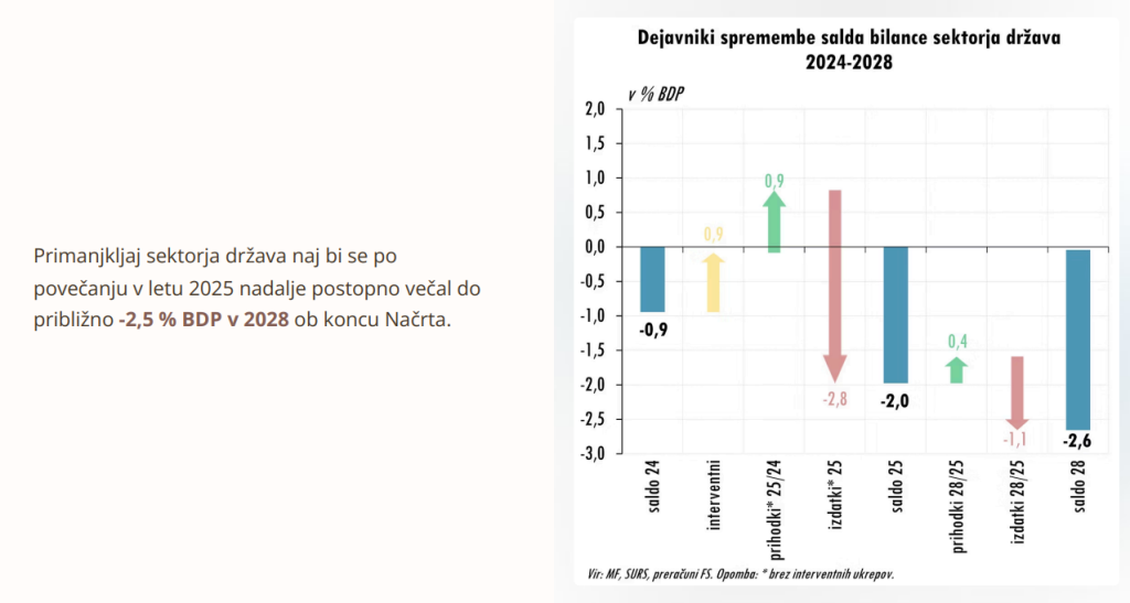 V Fiskalnem svetu RS so namreč izračunali, da bi se primanjkljaj sektorja država do leta 2028 povečal na približno 2,5 odstotka BDP, predvsem zaradi rasti tekoče porabe, povezane s spremembo plačnega sistema v javnem sektorju.