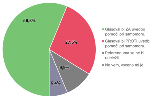 Referenduma o zakonu o pomoči pri prostovoljnem končanju življenja se bo sodeč po anketi Ninamedie (Dnevnik) udeležilo 61,7 odstotka anketiranih. Zakon bi podprlo 54,3 odstotka vprašanih, 30,6 odstotka vprašanih pa zakonu nasprotuje. 18,6 odstotka jih je bilo še neodločenih, nekaj manj kot 20 odstotkov anketiranih pa se referenduma ne bo udeležilo.
