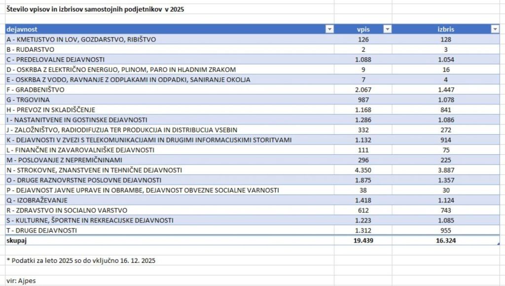 Zanimiv je trend vpisov in izbrisov. Leta 2020 se je v sistem s.p.-jev vpisalo skoraj 15.400 posameznikov, izbrisanih je bilo 14.446. V letu 2024 je bil ta razkorak veliko večji, 20.040 vpisov in 16.519 izbrisov, v letu 2025 pa je razlika nekaj manjša, saj so do 16. decembra na Ajpesu zabeležili 19.439 vpisov in 16.324 izbrisov.