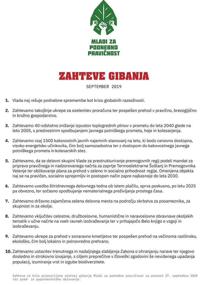 Klikni za povečavo. Zahteve gibanja mladi za podnebno pravičnost. Vir Facebook/mladizapodnebnopravicnost