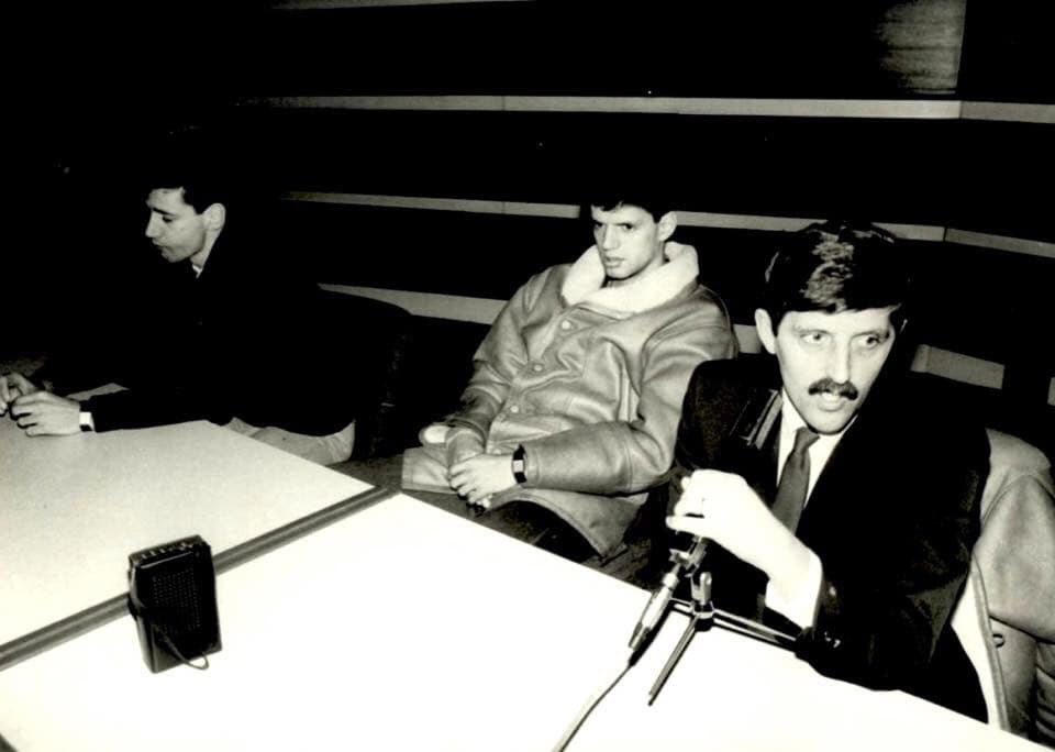 Iz leve proti desni: Aleksandar "Aco" Petrović, Dražen Petrović in trener Janez Drvarič. Tiskovna konferenca pred finalno tekmo Pokala pokalnih zmagovalcev Cibona Zagreb vs. Scavolini Pesaro, 16.3.1987. (Foto: Facebook Janez Drvarič)