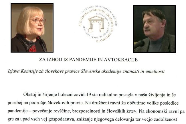 Komisija za človekove pravice Slovenske akademije znanosti in umetnosti (SAZU) je v javnost poslala izjavo z naslovom Za izhod iz pandemije in avtokracije, kjer desnosredinsko vlado med drugim obtožujejo avtokratičnega vodenja države ter ravnanja v škodo bolnikov v času koronavirusne pandemije.