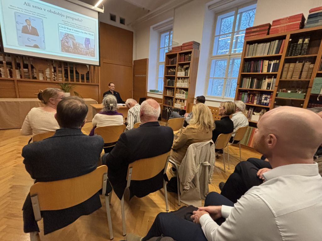 Zahodna civilizacija je od množičnih migracij leta 2015 doživela številne ekonomske, geopolitične in etične pretrese. Razprava o tem, ali Zahodu grozi propad, je naposled prodrla v ospredje, je na predavanju pojasnil dr. Kočevar. Tako je o tej temi februarja lani na varnostni konferenci v Münchnu govoril ameriški podpredsednik James David Vance, pozneje je to temo naglasil ameriški predsednik Donald Trump v svojem jesenskem nagovoru Združenim narodom.
