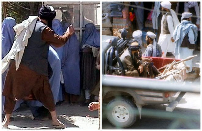 Talibanska moralna policija patruljira po ulicah, Herat, julij 2001. Vir: Wikipedia
