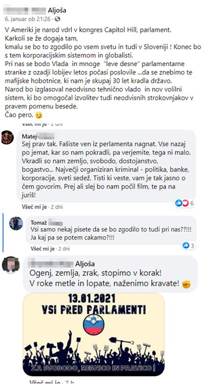 Dogajanje v ZDA se v slovenskih Facebook skupinah jemlje kot vzor, "kar se bo zgodilo po vsem svetu in tudi v Sloveniji." Pojavljajo se parole "fašiste ven iz parlamenta", "naženimo kravate" in podobni. Nestrpnih in sovražnih izjav ter pozivov k obračunu v skupinah kot je Vseslovenska vstaja naroda, ne manjka.