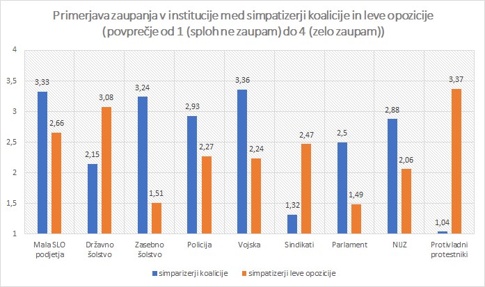 A glavne razlike pri stopnji zaupanja do institucij med privrženci vladne koalicije in leve opozicije pridejo pri nekaterih drugih institucijah.
