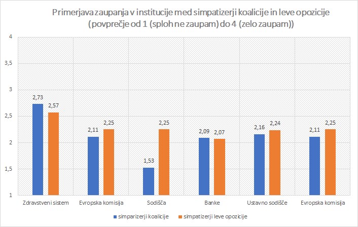 Najprej k podobnostim. Obstajajo institucije, do katerih tako eni kot drugi gojijo primerljivo (ne)zaupanje. Takšen je denimo zdravstveni sistem, ki, glede na druge institucije, uživa relativno visoko zaupanje. Tako med privrženci koalicije kot leve opozicije je precej več tistih, ki zdravstvu zaupajo kot obratno. Je pa zaupanje nekoliko višje pri volivcih vladnih strank.