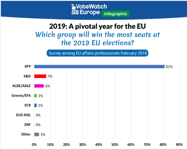 In ti so večinsko, 81 % prepričani, da bo največ sedežev v Evropskem parlamentu ponovno dobila Evropska ljudska stranka (EPP) in s tem tudi obdržala predsednikovanje Evropski komisiji. 7 odstotkov vprašanih meni, da bi to lahko bila skupina Naprednega zavezništva socialistov in demokratov (S&D), 6 odstotkov pa jih je prepričanih, da bodo zmagale članice Zavezništva liberalcev in demokratov za Evropo (ALDE).