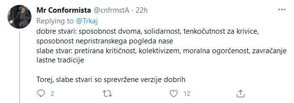 Tviteraši opozarjajo tudi na erozijo tradicionalnih vrednot, saj leve politike uničujejo tradicionalno politiko in ustvarjajo multikulturno družbo. Očitajo jim tudi pretirano radodarnost do lenuhov, ki ne želijo delati, ter preobilno financiranje nepotrebnih nevladnih organizacij. Moti jih tudi radikalnost Levice in SD in nezmožnost artikulirati pozitivno alternativo, ki bi presegla obsedenost s "samo da ni Janša" logiko.