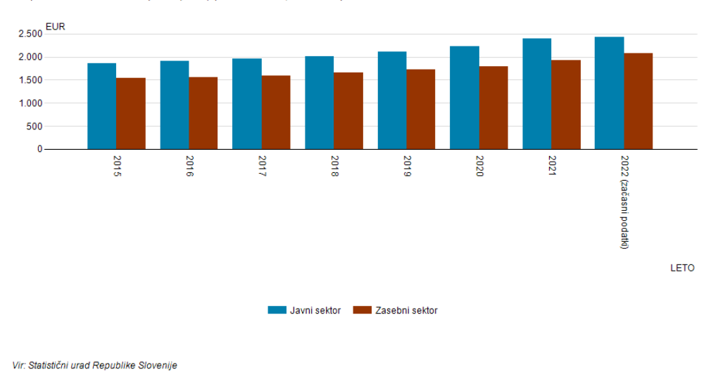 Kot lahko razberemo iz podatkov SURS, se je povprečna bruto plača od leta 2015 zvišala za oba sektorja, a medtem ko je povprečna bruto plača v zasebnem sektorju leta 2015 znašala 82,6 % povprečne bruto plače v javnem sektorju, je leta 2022 znašala 85,5 %. Povprečna bruto plača v javnem sektorju se je tako z 1.859 evrov leta 2015 dvignila na 2.430 evrov leta 2022, povprečna bruto plača v zasebnem sektorju pa z 1.536 evrov leta 2015 na 2.077 evrov leta 2022.