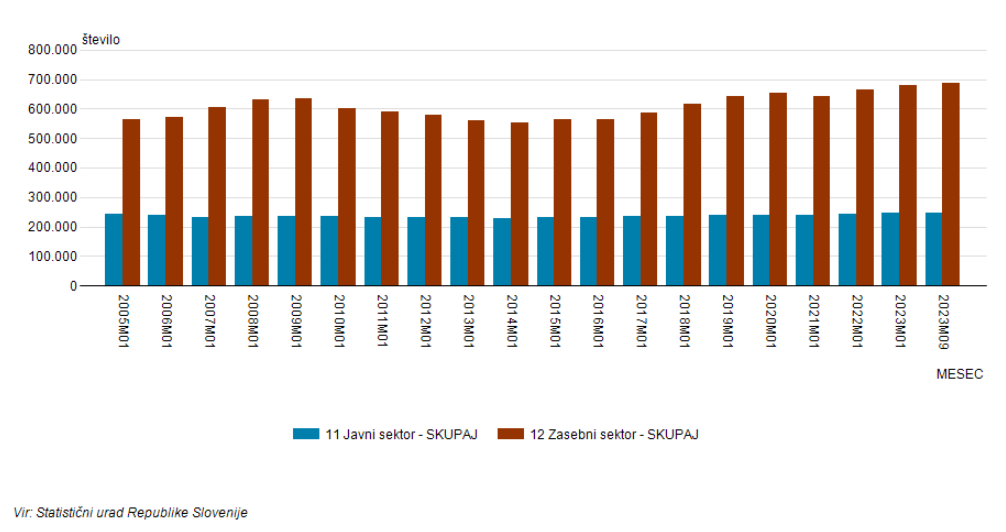 Število zaposlenih v javnem sektorju se od leta 2005 ni bistveno spremenilo. Najnižjo vrednost (228 tisoč) je doseglo leta 2014, od takrat pa se je zopet dvignilo na trenutno največje število, 246 tisoč zaposlenih. Najnižjo vrednost je enako leta 2014 doseglo število zaposlenih v zasebnem sektorju, a tu so nihanja bolj izrazita.