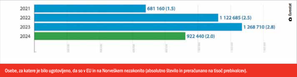 Po podatkih Frontexa, agencije za mejno in obalno stražo EU, so se nezakonite migracije v EU v prvih devetih mesecih leta 2025 v primerjavi z lanskim letom zmanjšale za 22 odstotkov. Mejo je nezakonito prečkalo 133.400 ljudi. Največji upad nezakonitih migracij je opazen na poteh iz zahodne Afrike (–58 odstotkov) in vzhodnega Balkana (–47 odstotkov). Najbolj je obremenjena osrednja sredozemska pot, ki predstavlja skoraj 40 odstotkov nezakonitih prihodov. V zahodnem Sredozemlju je bilo opaženo 28-odstotno povečanje nezakonitih prehodov. Med nezakonitimi migranti je največ prebivalcev Bangladeša, Egipta in Afganistana.