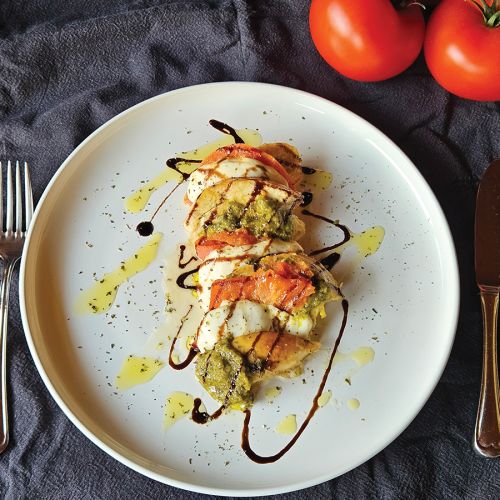 Količina: za 2 osebi Zahtevnost: Enostavno Čas priprave: 45 minut Sestavine: 1 piščančje prsi 1 paradižnik 1 mocarela pesto iz bazilike sol origano oljčno olje glazura iz balzamičnega kisa Postopek: Segrejemo ponev za žar. Dodamo nekaj kapljic oljčnega olja. Piščančje...