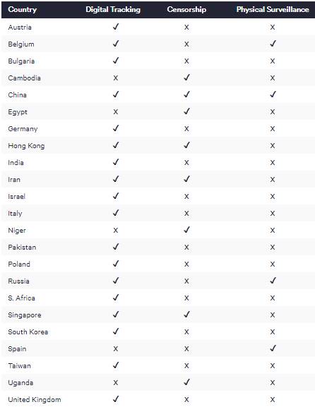 Od izbruha koronavirusa je veliko vlad po celotnem svetu sprejelo tudi ukrepe, ki se nananašajo na telefonsko sledenje, fizični nadzor in celo cenzuro. 20 držav svoje državljane nadzira preko telefonskega sledenja, od tega jih je 8 v Evropi (nadzor je v večini njih anonimiziran). Cenzure se ne poslužuje nobena evropska država (na svetu 6), 3 evropske države (na svetu 7) pa se poslužujejo fizičnega nadzora ( video nadzor s kamerami in droni, naprave, ki zaznavajo toploto telesa in podobno).