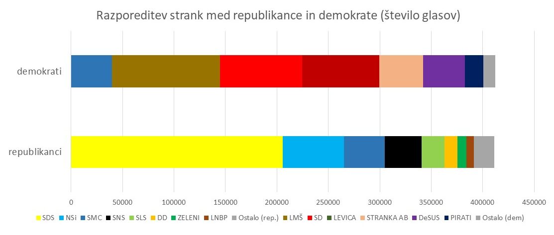 Slovenski "republikanci" in "demokrati" po strankah. Na premici je prikazano število glasov na državni ravni, ki so jih prejeli na volitvah leta 2018.