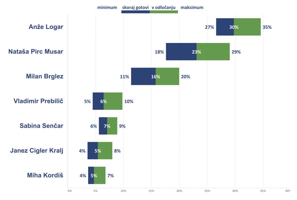 Raziskava Mediane, opravljena za POP TV in časnik Delo, ki je bila objavljena v četrtek, kaže na močno podporo Anžeta Logarja. Med tistimi, ki pravijo, da se bodo volitve udeležili, bi ga volilo 30,1 %. Na drugem mestu je Nataša Pirc Musar z 20,5 %, na tretjem pa Milan Brglez s 17,3 %.