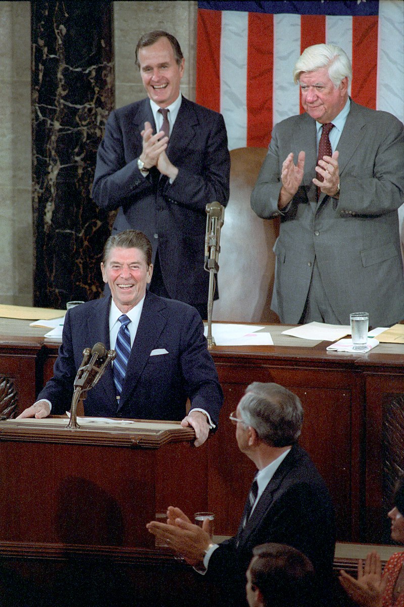 Predsednik Ronald Reagan pri nagovoru kongresa leta 1981. Zadaj levo stoji njegov podpredsednik George Bush st., kasnejši predsednik. Vir: Wikipedija
