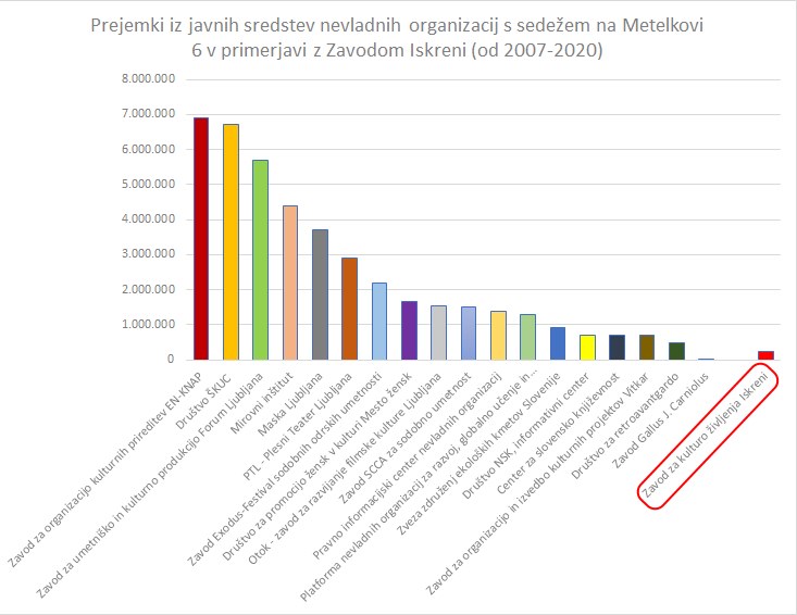 Če primerjavo prejemkov javnih sredstev organizacij z Metelkove z Zavodom Iskreni, ki, za razliko od njih, za svoje prostore na Nazorjevi v Ljubljani plačuje najemnino, podamo v grafu, dobimo: