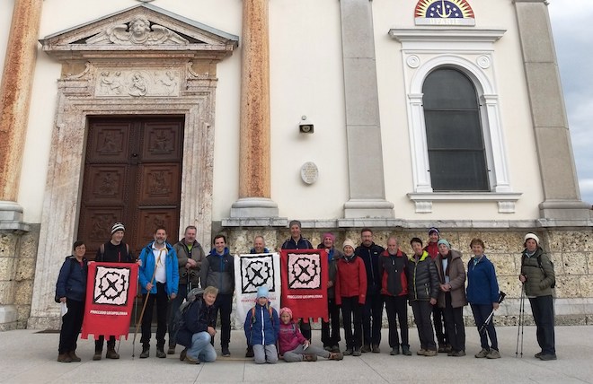 Aleksander Igličar med pasijonskimi romarji na cilju peš romanja iz Škofje Loke na Brezje.[/caption]