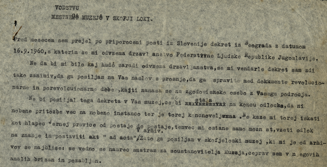 Pismo dr. Tineta Debeljaka vodstvu Loškega muzeja, potem ko mu je Jugoslavija odzvela državljanstvo (vir: NUK, rokopisna dediščina dr. Tineta Debeljaka)[/caption]