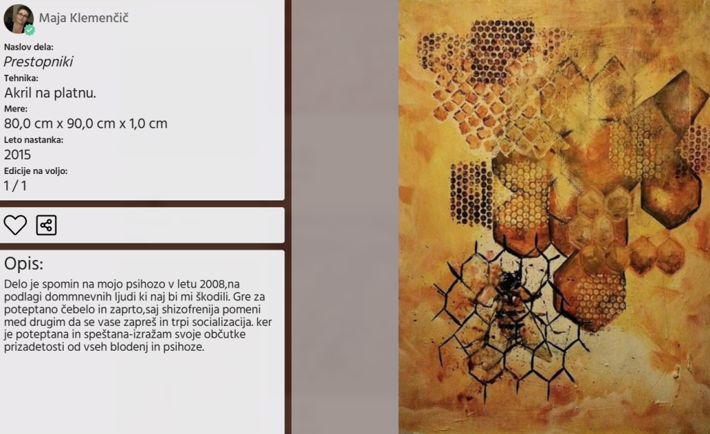 Majina zgodba razgalja podobo o začaranem krogu tistih, ki se kljub postavljeni diagnozi in vsem svojim težavam s pridruženimi boleznimi trudijo delati. Shizofrenijo so ji diagnosticirali pred 20 leti, srednje šole nikoli ni dokončala. Nekaj časa je imela odprto osebno dopolnilno delo, kar pa – ne glede na obseg dela – prinese absurdno malo delovne dobe. Ima status invalida, vendar pa se invalidsko ne more upokojiti, ker ima premalo delovne dobe. Prejemala je tudi socialno pomoč, ki pa se ji je ob vsaki donaciji znižala ali pa je ostala brez nje. Sedaj je odprla s.p. in kot slikarka prodaja svoja umetniška dela. Hkrati pa še vedno prosi za donacije, saj živi v finančnem pomanjkanju. Vesela je vsakega evra, tudi bonov za hrano. Ljudje, ki zbolijo mladi, lahko v Sloveniji hitro obtičijo – brez dovolj delovne dobe za pokojnino in brez realne možnosti, da bi jo zaradi bolezni kdaj dosegli. V praksi to pogosto pomeni dolgotrajno odvisnost od socialne pomoči in donacij.