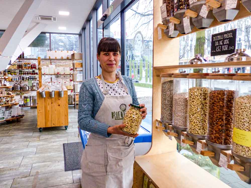 Danes je to nekoliko lažje tudi zaradi ljudi, kot sta Manca Behrič in Primož Cigler, ki sta pred tremi leti odprla trgovino Rifuzl, prvo trgovino v Sloveniji, v kateri vse artikle kupite brez plastične embalaže.