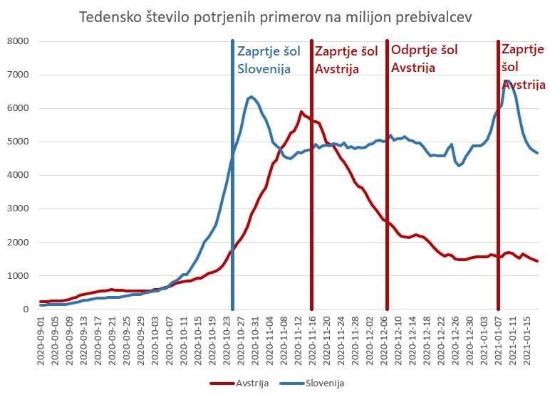 Slovenija je šole zaprla 26. oktobra, ko je bilo skupno število tedensko odkritih okužb v Sloveniji 5000 na milijon prebivalcev. V Avstriji je bila istočasno številka pri 1957. A tudi v Avstriji se je število okuženih naglo povečevalo, zato so 16. novembra, ko je tedensko število okužb znašalo 5.628, uvedli stroge omejevalne ukrepe in šole zaprli.