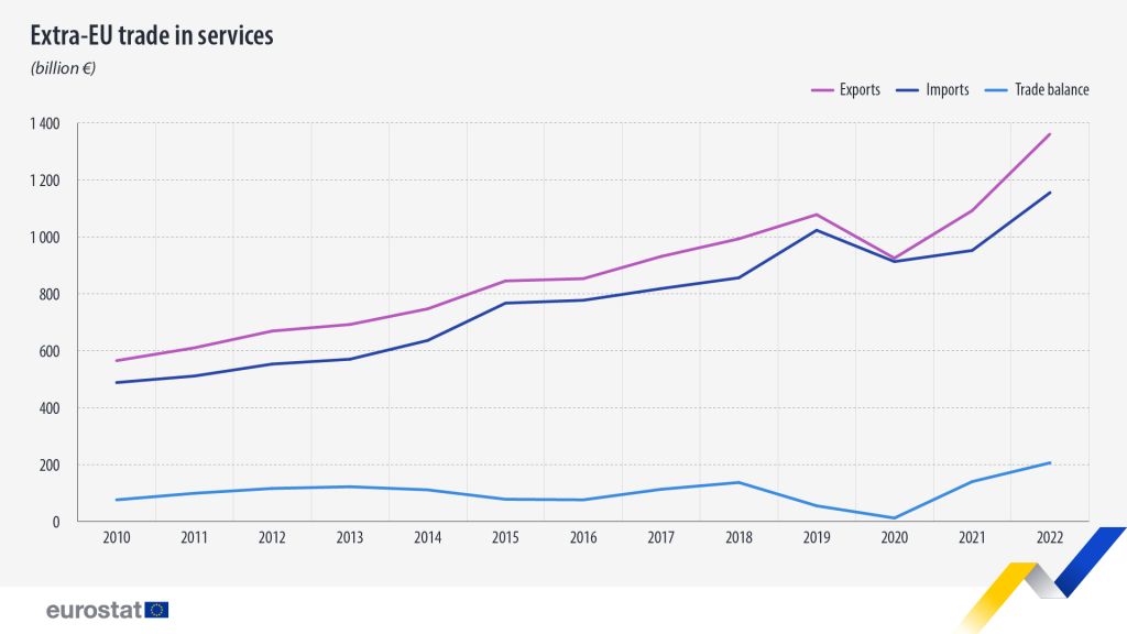 Leta 2022 so države EU v države zunaj EU izvozile storitve v vrednosti 1.361 milijard evrov (+25 % v primerjavi z letom 2021). Uvoz izven EU je znašal 1 155 milijard evrov (+21 % v primerjavi z letom 2021). To pomeni močno okrevanje po padcu, ki smo ga doživeli leta 2020 zaradi vpliva pandemije COVID-19 in s tem povezanih sanitarnih ukrepov.