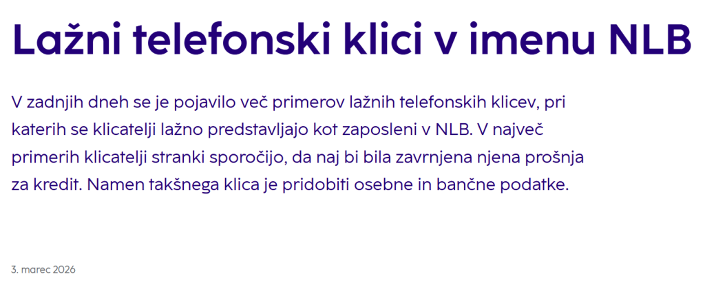 V zadnjih dneh se je pojavilo več primerov lažnih telefonskih klicev, pri katerih se klicatelji lažno predstavljajo kot zaposleni v NLB. V največ primerih klicatelji stranki sporočijo, da naj bi bila zavrnjena njena prošnja za kredit. Namen takšnega klica je pridobiti osebne in bančne podatke.