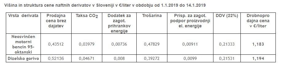Toda k temu je, kot vidite v tabeli spodaj, potrebno prišteti še takso CO2, dodatek za zagotavljanje prihrankov energije, trošarino in prispevek za zagotavljanje podpore proizvodnji električne energije. Nazadnje se na vse skupaj obračuna še 22 % DDV. Od vsakega prodanega litra 95 oktanskega bencina tako država dobi 0,75 EUR, od vsakega prodanega litra dizelskega goriva pa 0,67 EUR.
